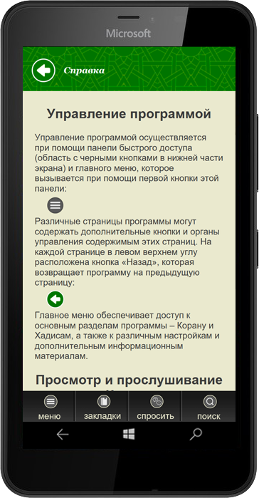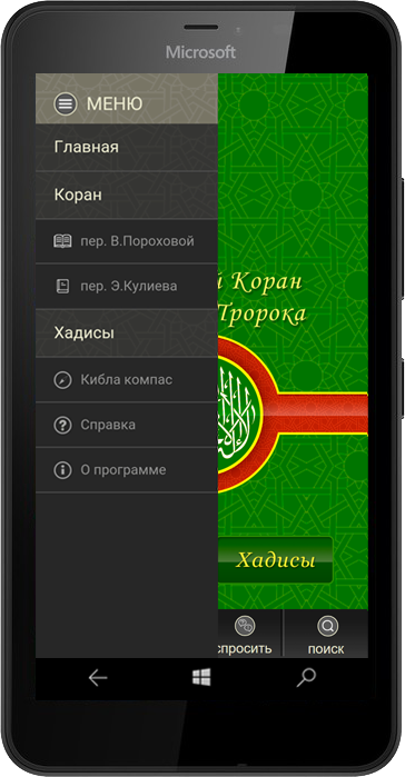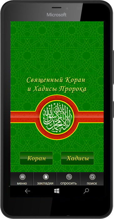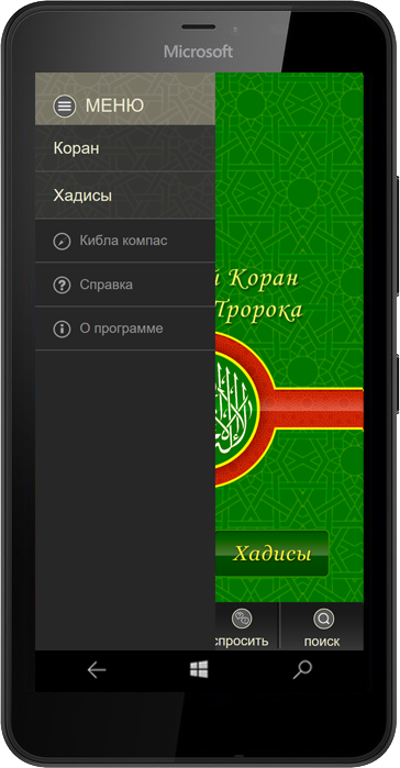 Главное меню обеспечивает доступ к основным разделам программы – Корану и Хадисам, а также к различным настройкам и дополнительным информационным материалам.