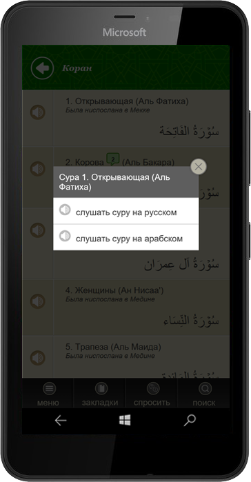 Всплывающее после нажатия на кнопку с динамиком звуковое меню позволяет начать прослушивание текста суры на русском или арабском языке.