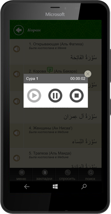 Всплывающее после нажатия на кнопку с динамиком звуковое меню позволяет начать прослушивание текста суры на русском или арабском языке. После выбора языка появится панель прослушивания звука с кнопками «Воспроизведение», «Пауза» и «Стоп»: