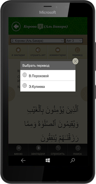 Выбрав в главном меню пункт «Коран», вы попадете в мини-меню выбора вариантов перевода: поэтический Иман Валерии Пороховой, являющийся в приложении базовым, либо прозаический Эльмира Кулиева. Используемый перевод обозначается иконкой раскрытой книги, неактивный перевод имеет иконку закрытой книги.