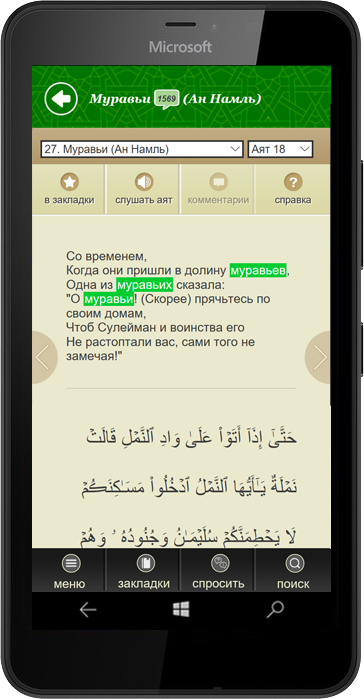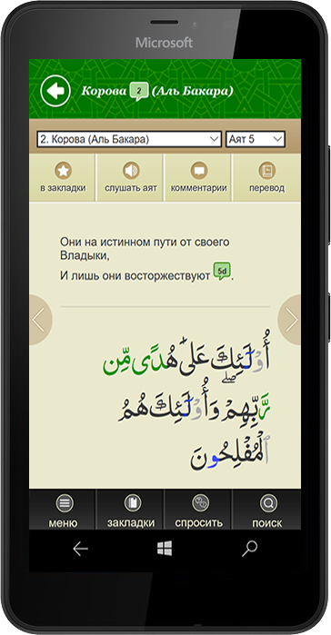 Комментарии открываются на отдельной странице. К каждому комментарию можно создать или удалить свою закладку. В тексте комментария могут быть выделенные синим цветом и подчеркнутые ссылки на другие комментарии, суры Корана или Хадисы. Нажав на такую ссылку вы перейдете на соответствующую страницу, а потом сможете вернуться обратно при помощи кнопки «Назад»:
