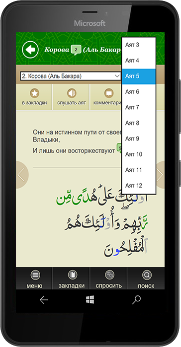 При помощи выпадающего списка сур можно быстро перейти к любой другой суре, а при помощи выпадающего списка айатов – к любому айату текущей суры.