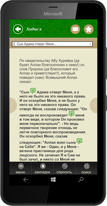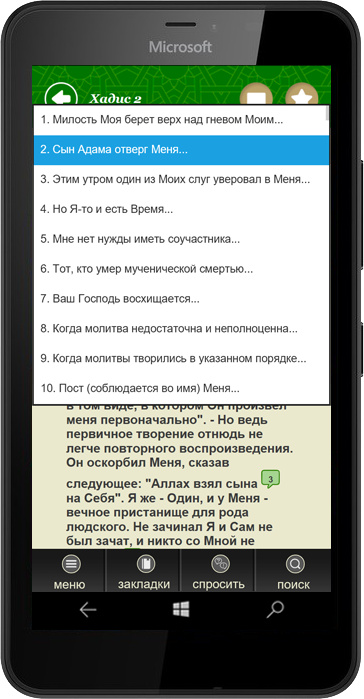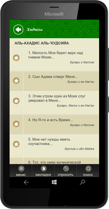 Выбрав в главном меню пункт «Хадисы», вы перейдете в прокручиваемый список всех Хадисов, разделенный на Хадисы ‘Кудси (Аль-Ахадис Аль-‘Кудсийа) и Хадисы Пророка.