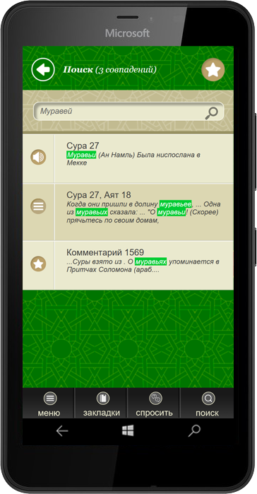 Вы можете найти в тексте Корана, Хадисов и комментариев любые слова и выражения с учётом русской морфологии. Чтобы выполнить поиск, напечатайте в текстовом поле слова или фразу, которые вы хотите найти, и нажмите значок с лупой:
