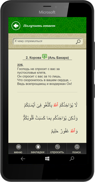 Программа выберет для вас определенный айат Корана, в котором вам нужно найти ответ на ваш вопрос. Этот оригинальный инструмент поможет вам раскрыть всю глубину и многогранность айатов Корана, в которых несомненно содержатся ответы на все интересующие человечество вопросы.