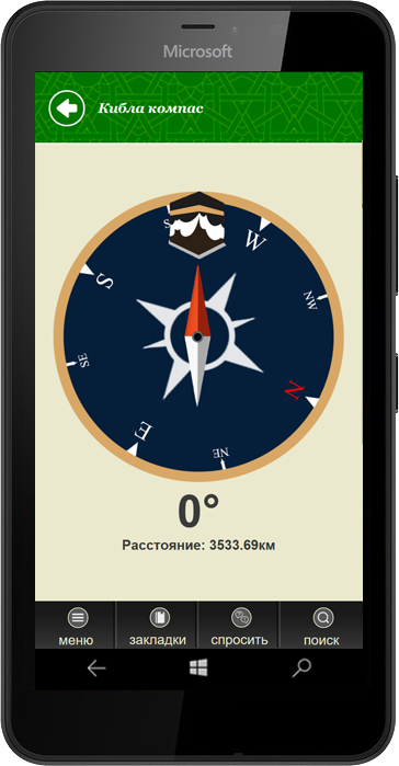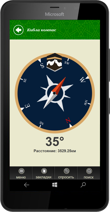 Пункт «Кибла компас» в главном меню поможет вам определить точное направление на Священную Каабу для исполнения молитвы:
