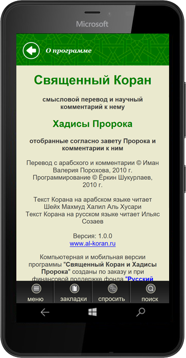 Выбрав пункт «О программе» в главном меню вы получите информацию о версии программы, ее разработчиках, авторах перевода Корана и Хадисов, дикторах русского и арабского звука, а также другую полезную информацию и ссылки на связанные с программой веб-сайты:
